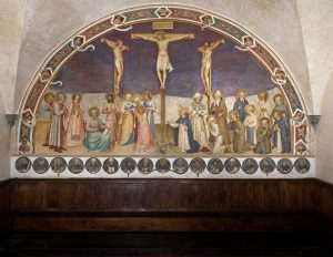 Al piano terra, la Sala del Capitolo è dominata dalla grandiosa Crocifissione con i santi, il più vasto e solenne affresco realizzato da Beato Angelico a San Marco. La composizione riunisce, attorno ai tre crocifissi, santi legati alla famiglia Medici, alla città di Firenze, all’Ordine domenicano e ai principali ordini monastici, offrendo una visione corale e monumentale della storia della Chiesa. Il percorso prosegue al primo piano e culmina con la celebre Annunciazione, una delle immagini più amate e iconiche della storia dell’arte. Nelle 44 celle del dormitorio del convento, un tempo destinate alla preghiera e al riposo dei frati, sono visibili gli affreschi di Beato Angelico che accompagnano il visitatore in un itinerario meditativo di straordinaria intensità: dalle Storie di Cristo del Corridoio dei chierici, alle immagini del Crocifisso con san Domenico in preghiera nel Corridoio dei novizi, fino alle scene evangeliche più narrative del Corridoio dei laici.